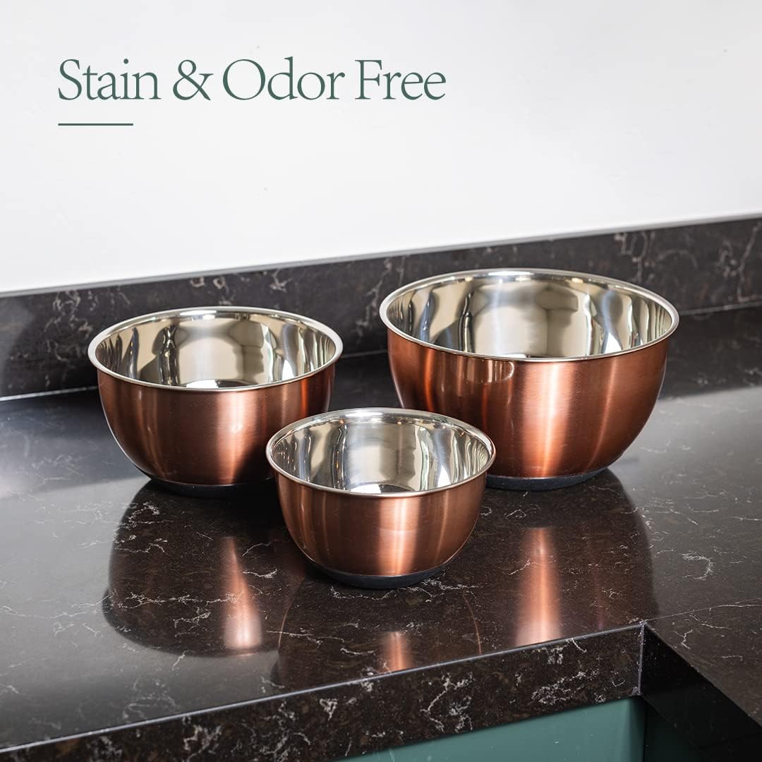 The Samma Copper Mixing Bowls are an ideal choice for professional chefs and home cooks alike. Made with copper, which has been a staple in kitchen accessories for thousands of years, our copper mixing bowls are durable, versatile, and great for a variety of cooking and baking needs. Our large-size mixing bowl is pure copper finished with a metal interior, providing an elegant yet rustic look that adds a touch of sophistication to any kitchen. Each copper bowl comes with a black, solid plastic lid that fits securely, keeping your food fresh and preventing messes. The smooth interior surface won't retain odors or food particles, making it easy to clean. With the ability to withstand temperatures exceeding 500°F, this copper mixing bowl set is durable enough for everyday use. Whether you're a professional chef or a novice cook, this versatile kitchen addition is ideal for any level of cooking.