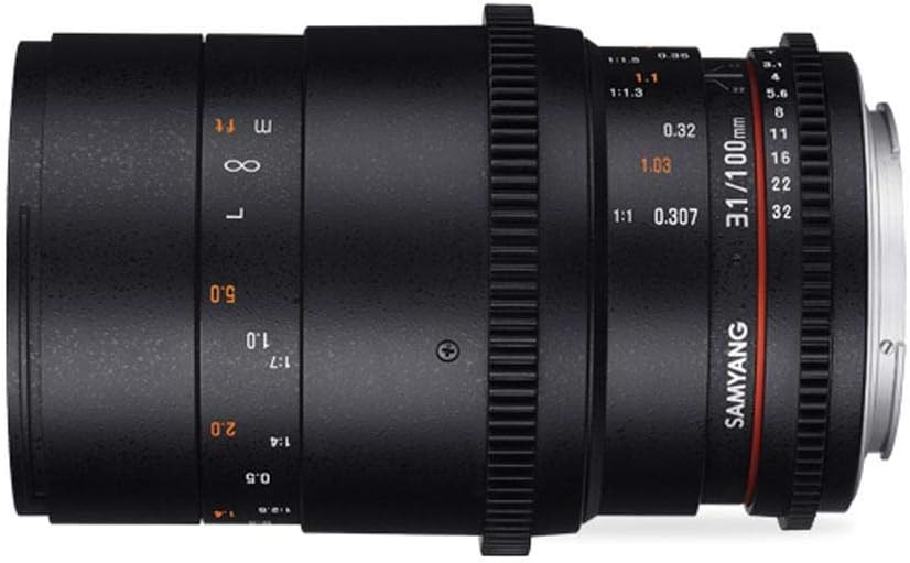 Samyang's 100mm T3.1 VDSLR ED UMC MACRO is a macro telephoto manual focus cine lens designed for full frame sensor sizes. With a maximum close-up magnification or 1:1, this macro lens features vivid colour and soft out-focusing, making it an ideal lens for close-up images of flowers and insects. It also can be used as a 100mm telephoto lens for landscapes and portraits. The Samyang 100mm T3.1 VDSLR ED UMC MACRO allows more delicate video work with T number marks on the lens body. The focus gear ring is compatible with follow focus systems, and you can change the aperture quietly and smoothly with the uncoupled aperture gear ring. Also, distance scale and T numbers are marked on both sides of the lens for convenience. Samyang 100mm T3.1 has a low T number of T3.1 allowing you to precisely control the lens when shooting under various exposure environments including relatively dark situations. The lens features 15 lenses in 12 groups, including a high refractive lens (HR) and an extra low dispersion lens (ED) to minimise colour aberration and unnecessary light dispersion, resulting in a high resolution throughout the image. Samyang's Ultra Multi Coating (UMC) is used to optimise the light penetration and minimises flare and ghosting. 0.307m minimum focusing distance helps to capture the object in close proximity. The lens features 9 aperture blades which are designed to be almost a full circle when the aperture is closed. This produces starlike rays clearly and beautifully. The solid frame of the lens is constructed from high-strength aluminium alloy which allows the lens to be lightweight, yet strong. A detachable petal-shaped lens hood further minimises flare and ghosting by sheltering the lens from unwanted stray light.
