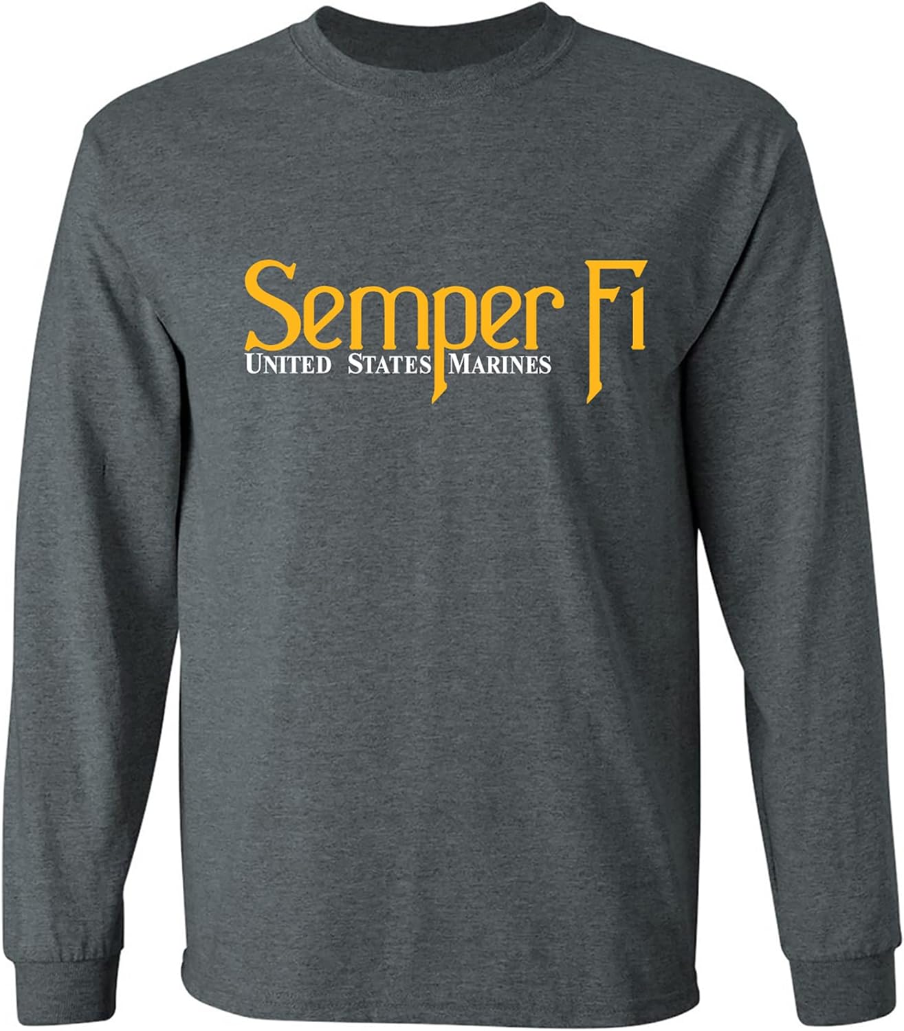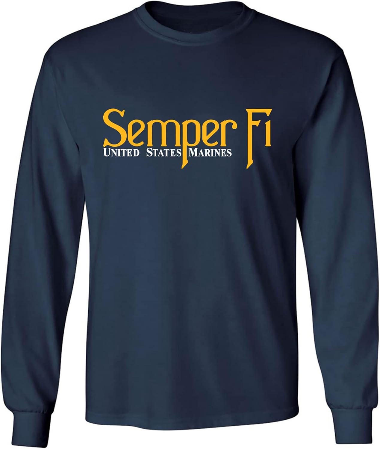 This military theme shirt features "Semper Fi United States Marines" on the front in white and gold on an Adult Long Sleeve T-shirt. Featuring a taped neck and shoulders for comfort and double-stitched sleeve and bottom hems for extra strength, our shirts are designed for both comfort and quality. Officially licensed by the United States Marine Corps. Printed in the USA on an imported garment.
