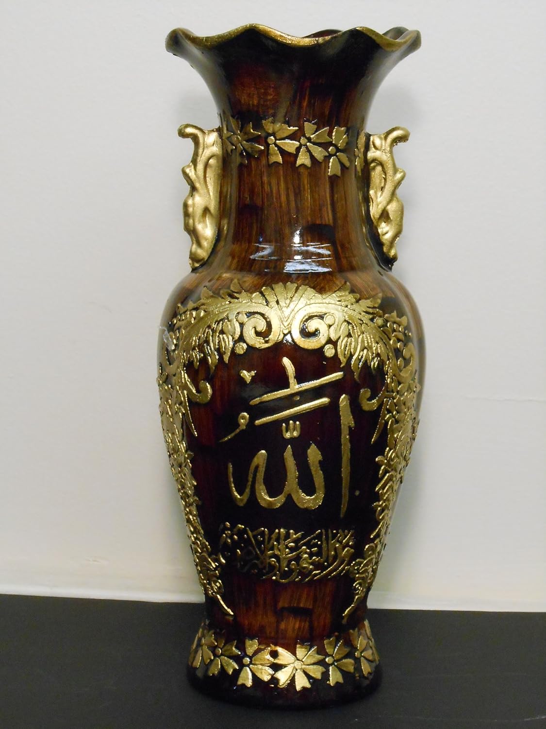 A brand new set of 2 islamic hand made ceramic vases with Allah written on one and Mohammad written on the other in gold color. The vases are beautifully designed to capture the eyes attention. They can be placed either at the entrance of your house or on a table top in your living room. This tempting item makes an exquisite statement in any decore ornament on the table. Images say it all.