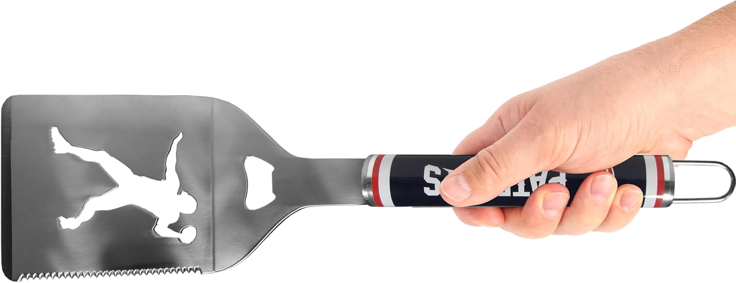 Our logo style BBQ set really catches your eye with vivid team digital graphics. The 430 grade stainless steel tools are tough, heavy-duty tools that will last through years of tailgating fun. The set includes a spatula with a bottle opener and sharp serated egde, grill brush and scraper tool, fork and tongs. Everything utensil a grill master needs!