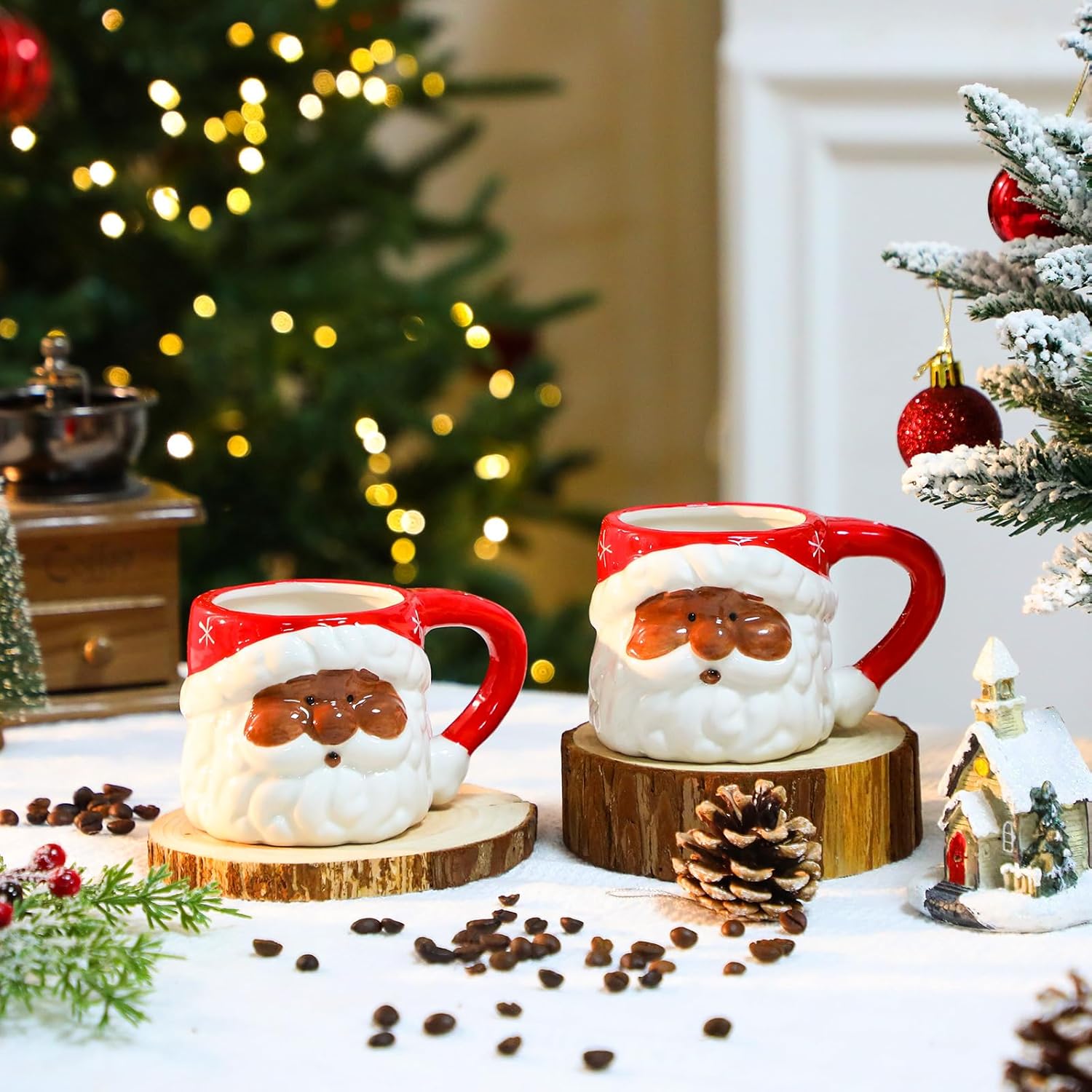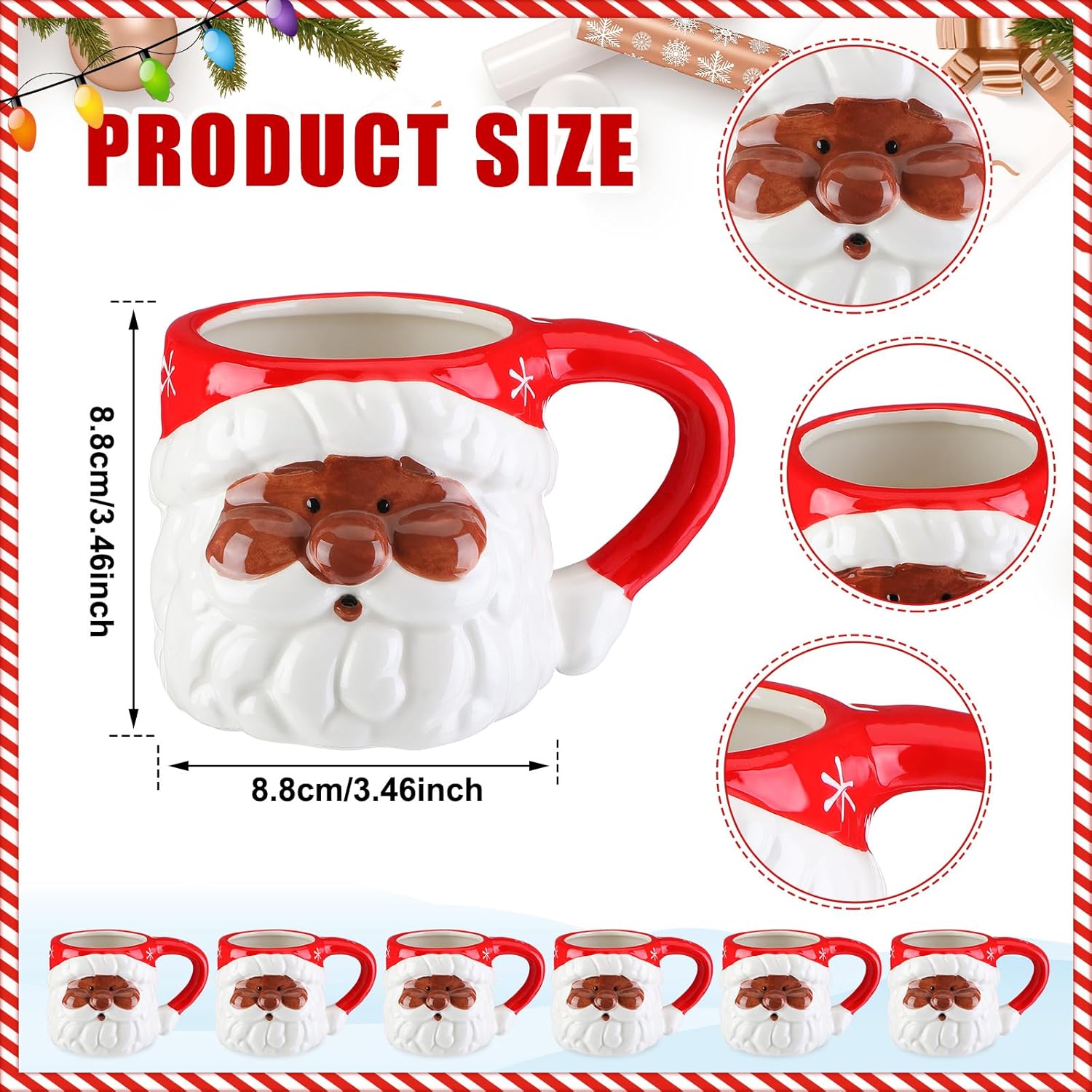 Features: There is a handle on the side of the Santa coffee mug, which is convenient for you to grasp and can also avoid accidental burns. You can use this cup at home, dormitories, offices, picnics, or camping. Rinse this red Santa mug with clean water after use. When not in use, it can be placed in the cabinet or hung on a storage shelf, without occupying too much space. You can also use it as a decoration in the living room or hallway to easily create a warm Christmas atmosphere. Specifications: Material: ceramic Color: red, white, brown Size: 11 oz Package includes: 6 x African American Santa coffee mugs Notes: Manual measurement, please allow slight errors on size. The color may exist a slight difference due to different screen displays.