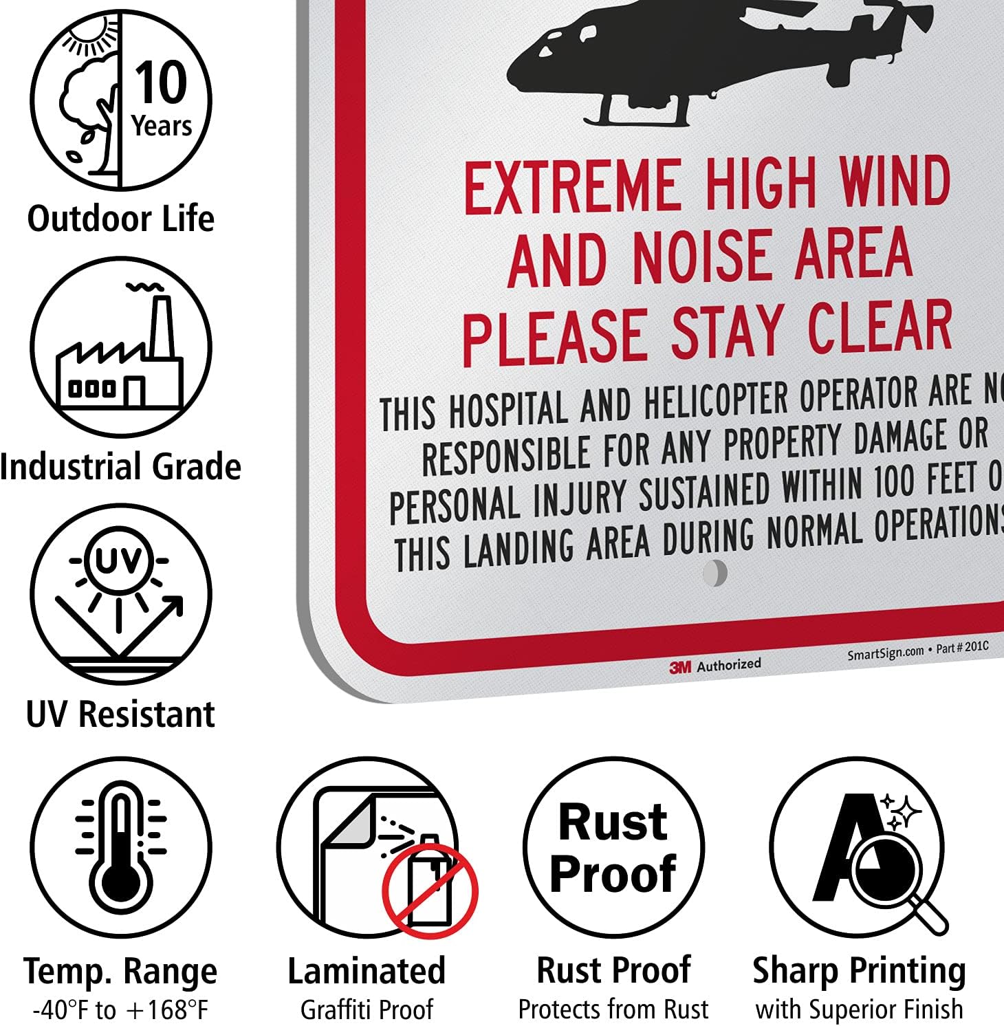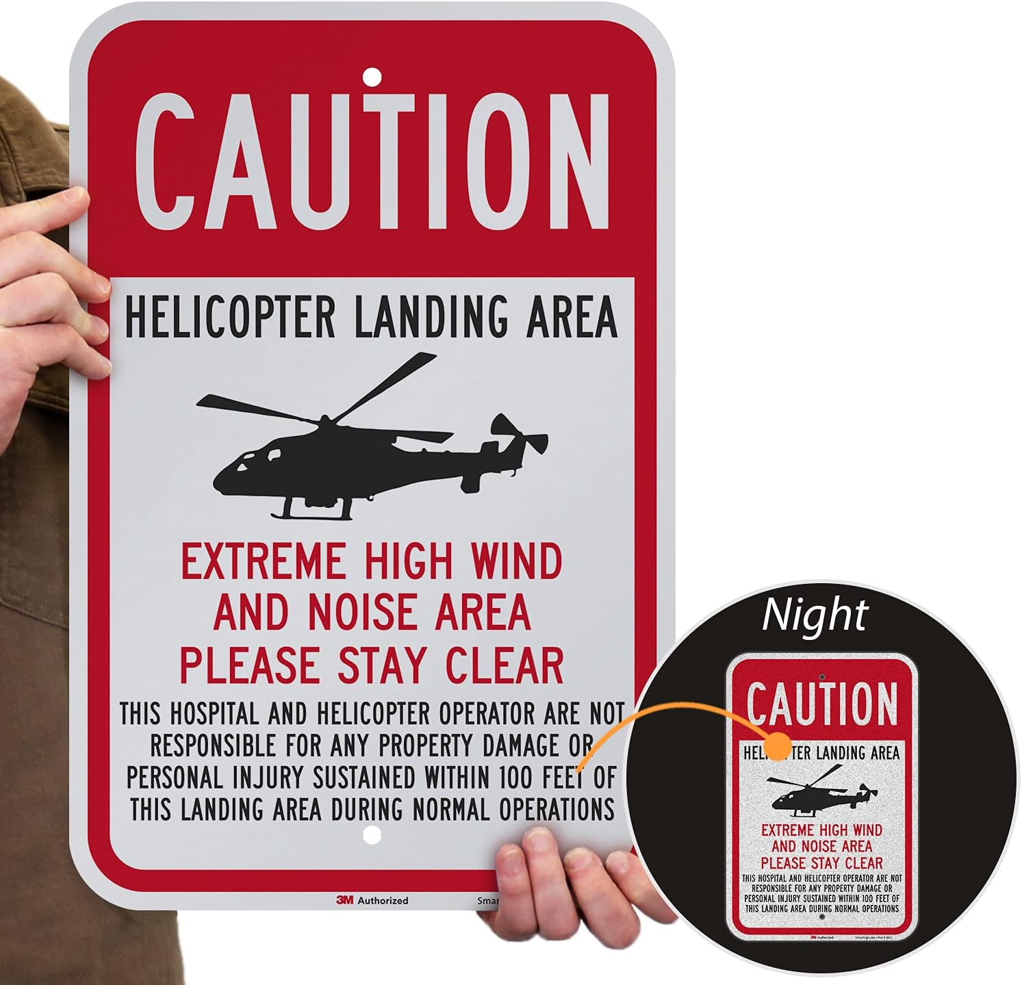 Engineer grade reflective aluminum rectangle caution sign, Legend "Caution - Helicopter Landing Area" with Graphic. It's a bird, it's a plane, it's a helicopter! Caution people to look up and stay alert. Signs are reflective and reflect light from a flashlight or a car's headlights. This is our most common traffic sign and parking sign material, but has countless applications in a factory, too. Signs are printed with 3M screen printing or 3M outdoor digital inks designed specifically for outdoor traffic and parking signs. Unlike competitive signs, these signs are proven to last outside and use 3M matching ink and film components throughout. Municipal-grade signs are used by countless agencies, governments and schools across the US. Sheeting meets the standard DOT specifications for construction of roads and bridges on Federal Highway Projects FP-85 for Sheeting Type II, Class 1 or 2 and the GSA LS-300C Class 1 or 2. The base material for these signs is a 80 mil thick non-rusting aluminum. Signs have rounded corners - for easy handling and a professional appearance. Competitive signs often use lower cost (and more hazardous) square corners. Signs have prepunched/precleared holes to insure a hassle-free installation. In a workplace setting, reflective aluminum signs are also used for emergency shut-offs, exits and evacuation marking. Signs lasts 10+ year outdoor life. Great water and chemical resistance. Typical maximum temperature 168 degree F. Mounts with screws or clips. Measures 12-inches width by 18-inches height. Red/black on white color combination.