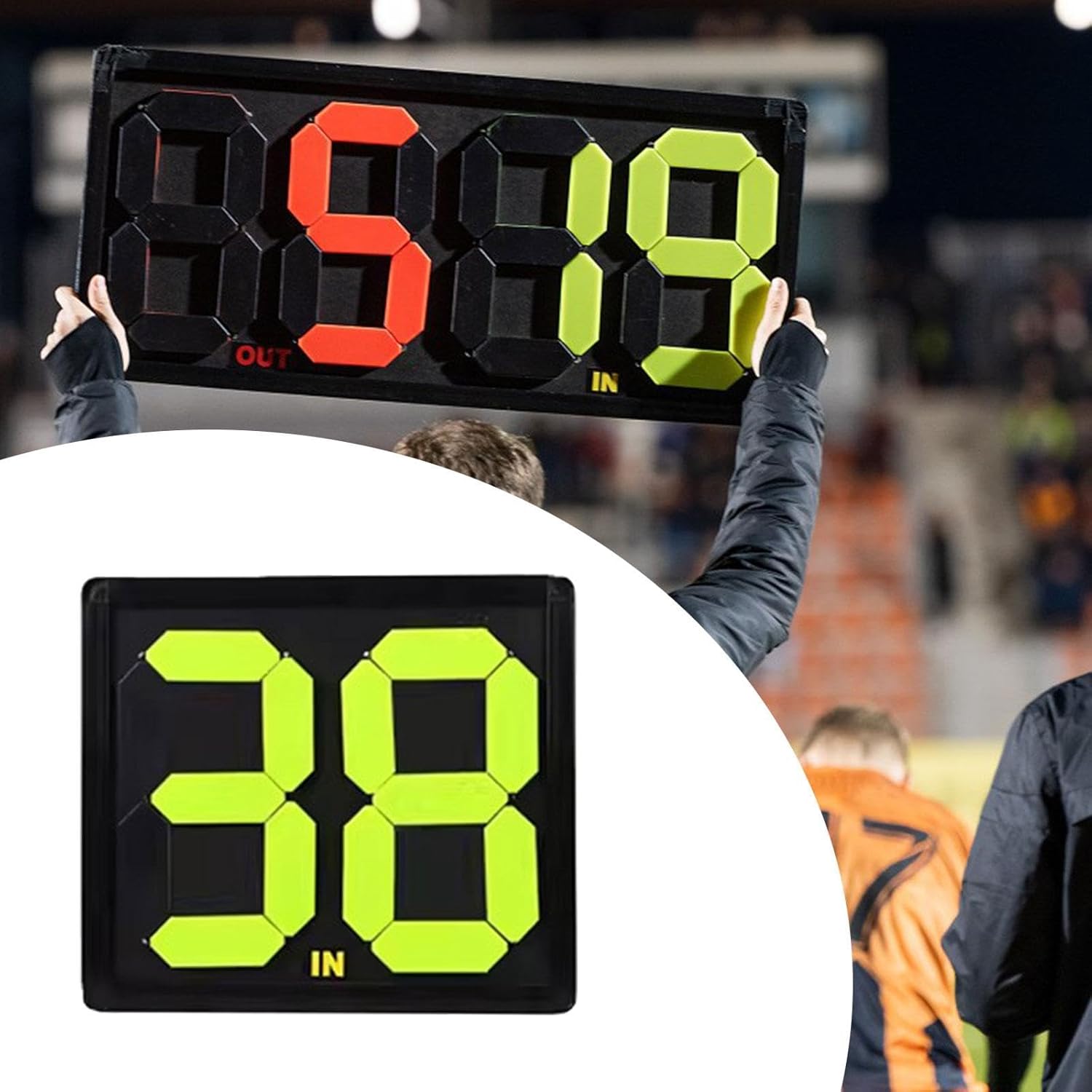 Description: - 【Convenient】: The board allows for numbers from 00-99 to be posted, for game alternatives and downtime.Simple interface, can be used as a substitution board or as a scoreboard. - 【Material】: Soccer Substitution Board made of PP material, neat corner cutting, fine workmanship, reinforced with rivets, sturdy - 【Compact Size】: Soccer Substitution Card dimensions are 43.6cmx38.5cm/17.17inchx15.16inch, Compact size convenient storage - 【Number Display】: Substitution Board is clear and identifiable even in rainy days from a long distance, ensures that anyone on the field can clearly see the score and substitution - 【Feature】: Double sided display, weather resistant, support Manually Fliping the number, convenient to use.Suitable for basketball, football, volleyball, table tennis, badminton, etc.Specification: - Material: PPSize Chart:43.6cmx38.5cm/17.17inchx15.16inchPackage Includes:1 Soccer Substitution BoardNote:Please allow slightly errors due to manual measurement and different monitors.