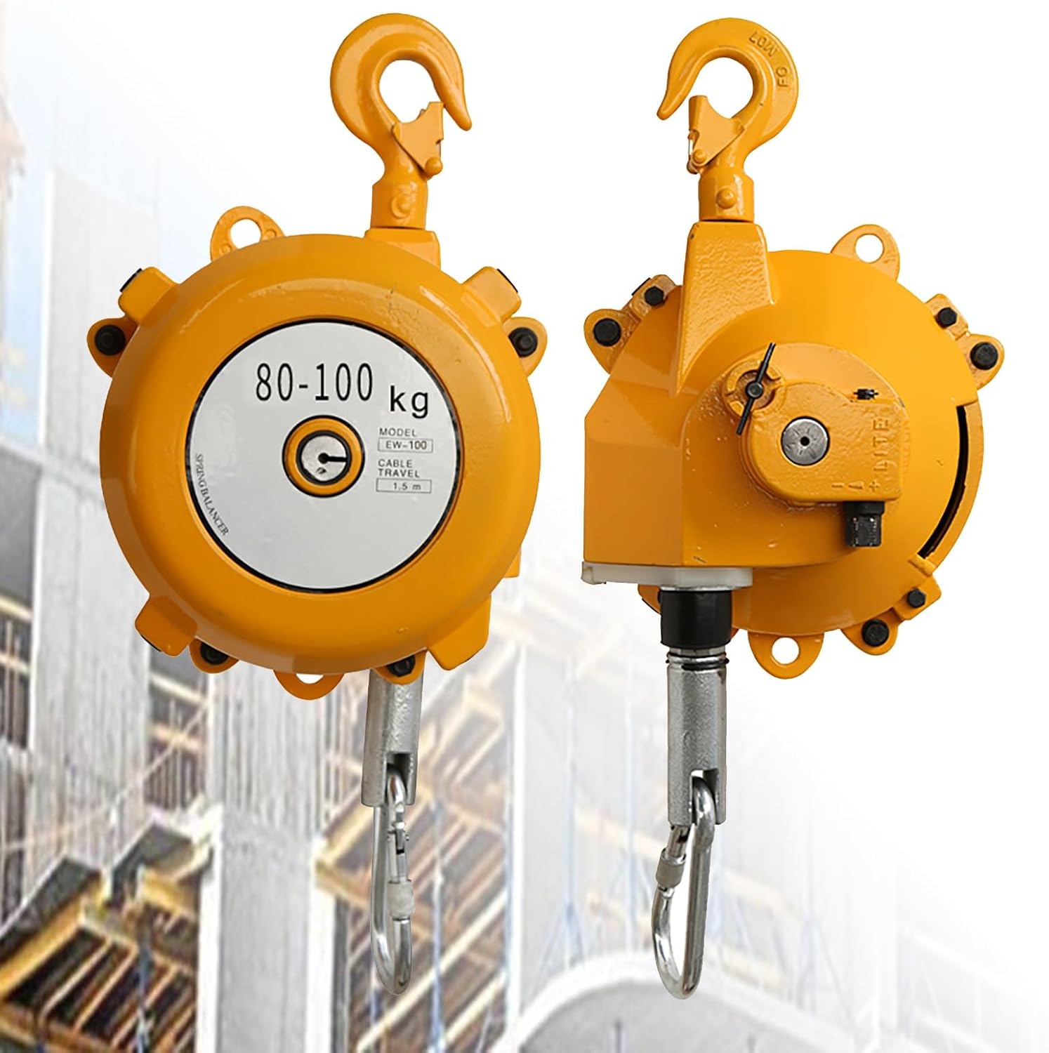 ** Spring Balancer - **Material:** Alloy Steel - **Load-Bearing Range:** 30-40kg, 40-50kg, 50-60kg, 60-70kg, 70-80kg, 80-100kg, 100-120kg, 120-140kg, 140-160kg (Ensure that the tool’s weight is within the specified load limits) - **Cable Length:** 1.5m **Package Contents** - Spring Balancer **Note:** 1. Product sizes may vary slightly, with an acceptable error of 1-2cm. Actual sizes will prevail. 2. Color differences may occur due to lighting, angle, or display variations. Please refer to the actual product for true colors. 3. Avoid pulling on the spring if the balancer is not gripping an object.