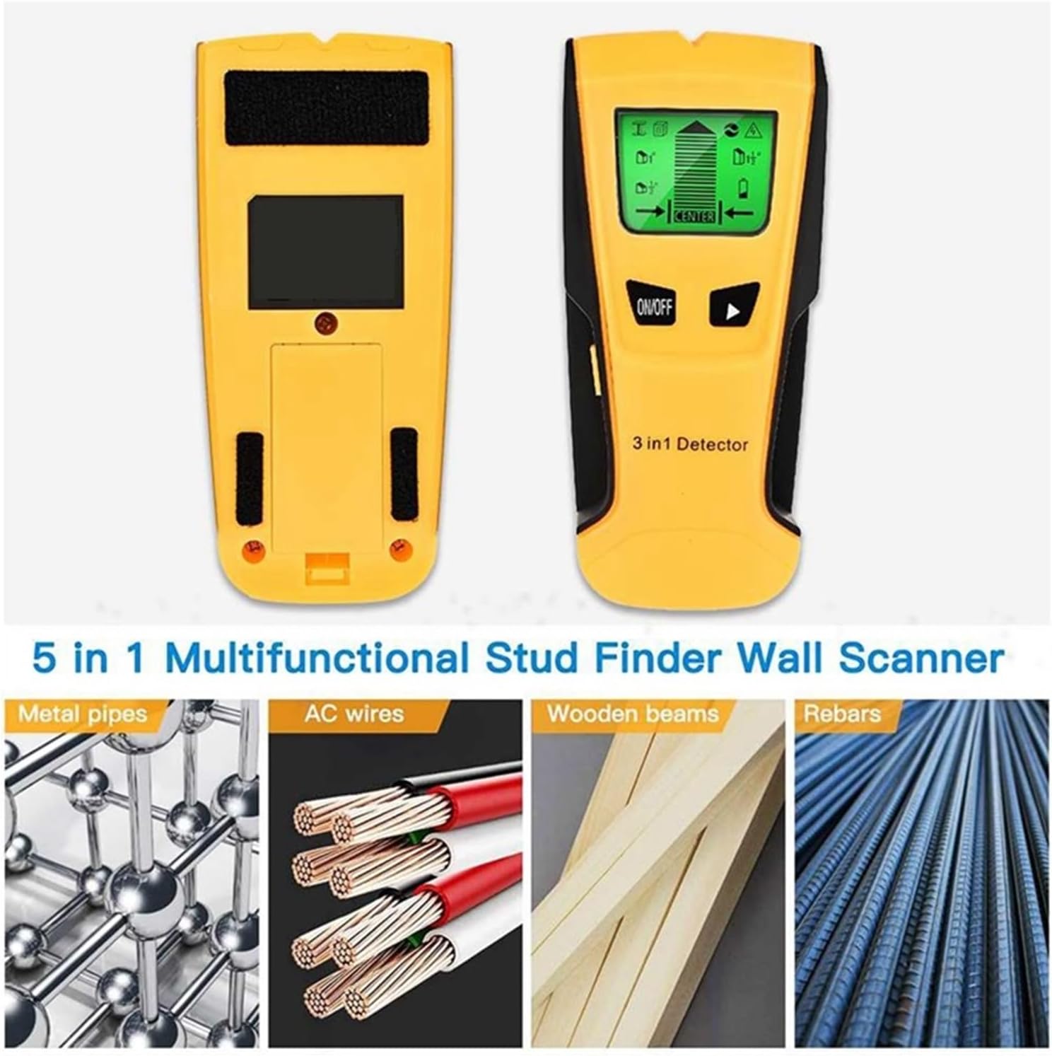 1. The wall stud finder can accurately and quickly find the edge and center of metal, studs, joists, pipes and live AC wires behind walls, floors and ceilings. Rapid detection saves users time and energy, making task completion easier.2. High visibility and comprehensive display, equipped with a bright backlit LCD display, which can show the center, edge and position of the detected studs and battery status.3. Multiple scanning modes, providing multiple scanning modes including stud scanning, depth scanning and metal scanning, allowing you to detect a variety of materials and depths.Learn about the equipment:This unit is a 3-in-1 metal/voltage/stud detector.It uses an electronic signal to locate the exact position of the stud.Ceiling joist AC wire and metal wire through. Drywall, concrete and other common wall materials.Once the edge of the stud is detected, it emits audio and visual (LCD display), allowing you to easily determine its center position.The unit is the perfect tool for professional electricians and users in the field of decoration.Function description:1. Check bolts2. Detect metal3. Check the AC live wire4. Use the metal detection function to find metal tubes, rivets or clamps hidden in the walls5. Automatic shutdown (30 seconds no operation)Metal detection: maximum depth 30MMCable inspection: Maximum depth 30MM1/2inchWood inspection (3 distance inspection):(13MM)1 inch (25MM)3 inch (38MM)Note: 1x9V battery is used without battery when shippedMaterial: PlasticColor: YellowPackage contents:1 metal detectorOnly the above packaging content is included, other products are not included.Note: Light reflections and different displays may cause the color of the item in the picture to be slightly different from the real thing. Measurement tolerance error +/- 1-3cm.