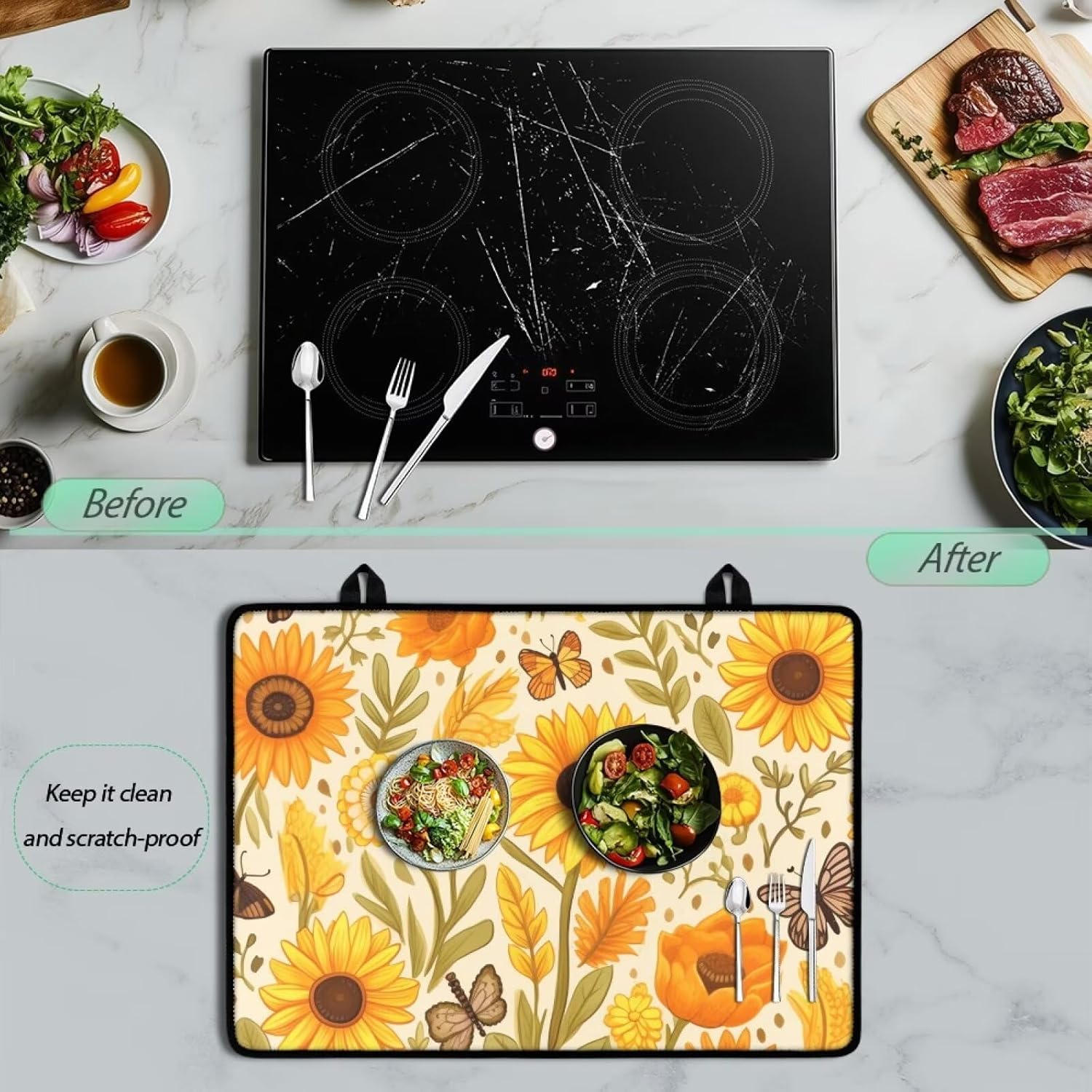 Basic Information Fabric: polyester rubber Size: 20.96x29.18 in/53.23x74.11cm Package Details: you will receive a glass cooktop protector Functional Features: Soft and thick, skin-friendly, comfortable and elastic, prevent burns or scratches on your kitchen tabletop, the back side is made of rough materia, non-slip, anti-oil stains, wear-resistant, good adsorption, it can be better fixed on the table without shifting The electric hob insulating mat covers food stains and grease stains from daily life, stops the grey layer and prevents scratches when the induction hob is not in use Hand washable or machine washable, it will remain as good as new for many washes, comes with a hanging rope to hang on the kitchen wall to prevent grease or stains Universal for most sizes of electric cookers, ovens, washing machines, can be used as a chopping mat in the kitchen, is a good helper for housewives, stylish personalised pattern, high temperature resistance, not easy to fade, is the perfect decoration for daily or special festivals