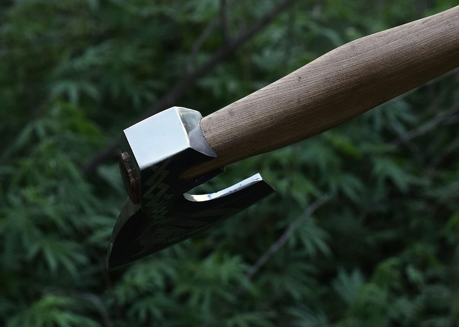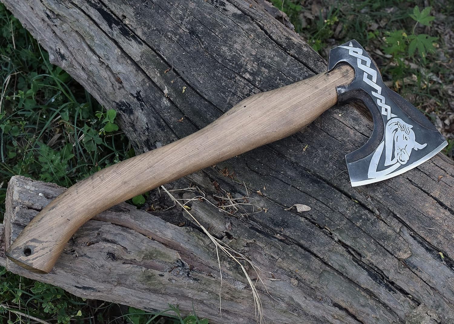Description: Long axe made with high carbon steel and Ash Wood. Axe head is given a beautiful texture by Etching. Axe head is long, up to 6.5 inches, perfect bevel with razor sharp cutting edge. The Blade shape is curved and convex. Whole edge from toe to heel retains equal sharpness and perfect bevel. The Long beard ends with the inside curve. Lug has an inner cut up to the cheek to give a gorgeous look to the axe head. There is a fixed nail in the eye to avoid handle loosing. Handle is made with high quality Ash Wood. This axe can be a gift to your loved ones on different occasions like anniversary, wedding, Christmas. This axe is not only a collectible but also a complete tool. It plays a vital role in wood splitting, removing tree bark, chips fly and piercing.