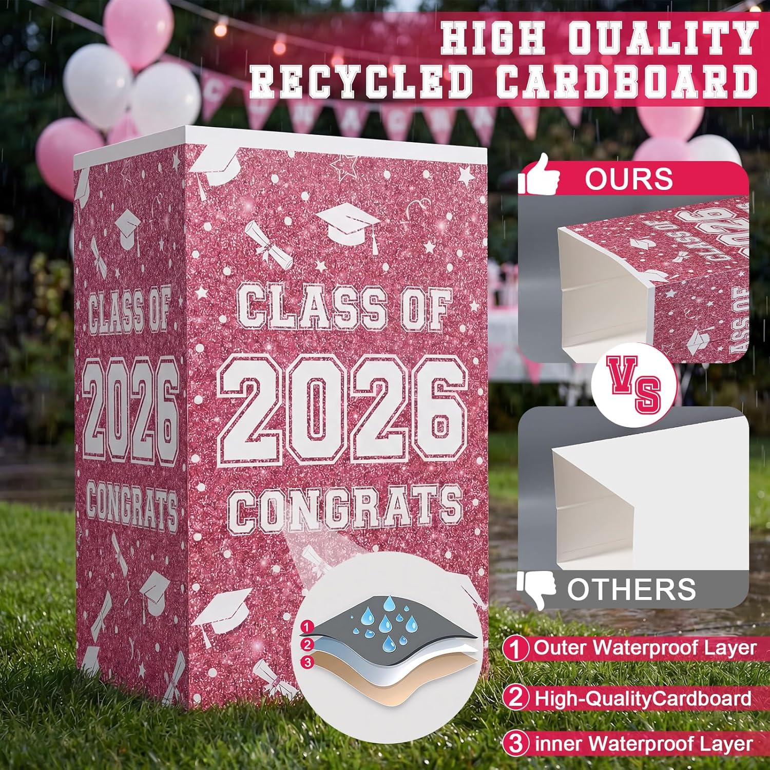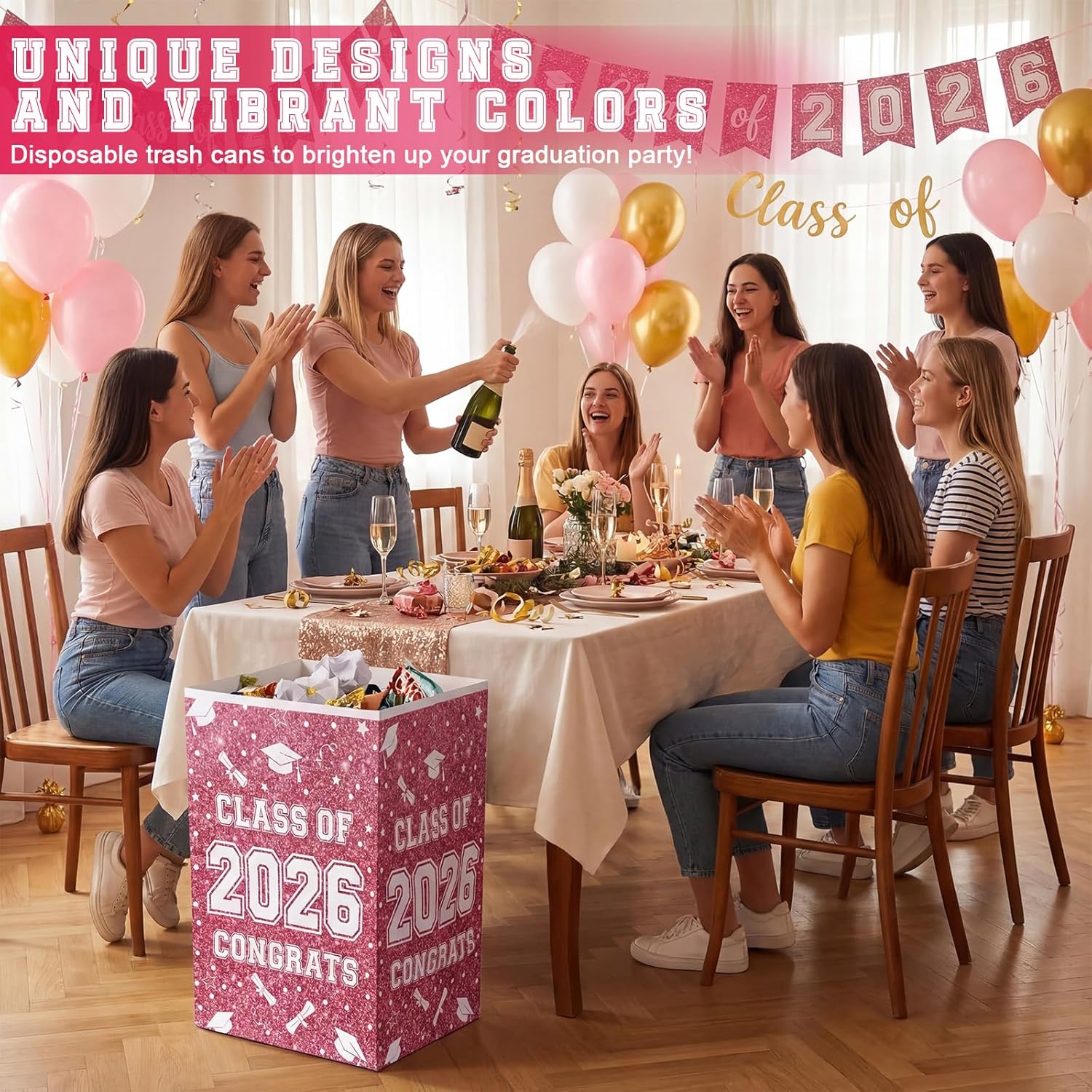 Features: THey can be set up in a flash, saving you precious time during the busy pre-party preparations. And when the graduation party are over, disposal is just as easy. Simply fold them up and toss them away, eliminating the hassle of cleaning and storing traditional trash bins. Despite being disposable, these graduation party trash cans are built to last. The thickened cardboard construction, combined with the waterproof coating, gives them excellent durability. They can easily withstand the wear and tear of a high-traffic graduation party, where guests are constantly moving around, dropping trash, and accidentally bumping into things. Specifications: Material: thickened cardboard Color: pink, white Size: About 13 gallon Package includes: 16 x Graduation disposable trash cans Notes: Manual measurement, please allow slight errors on size. The color may exist a slight difference due to different screen displays