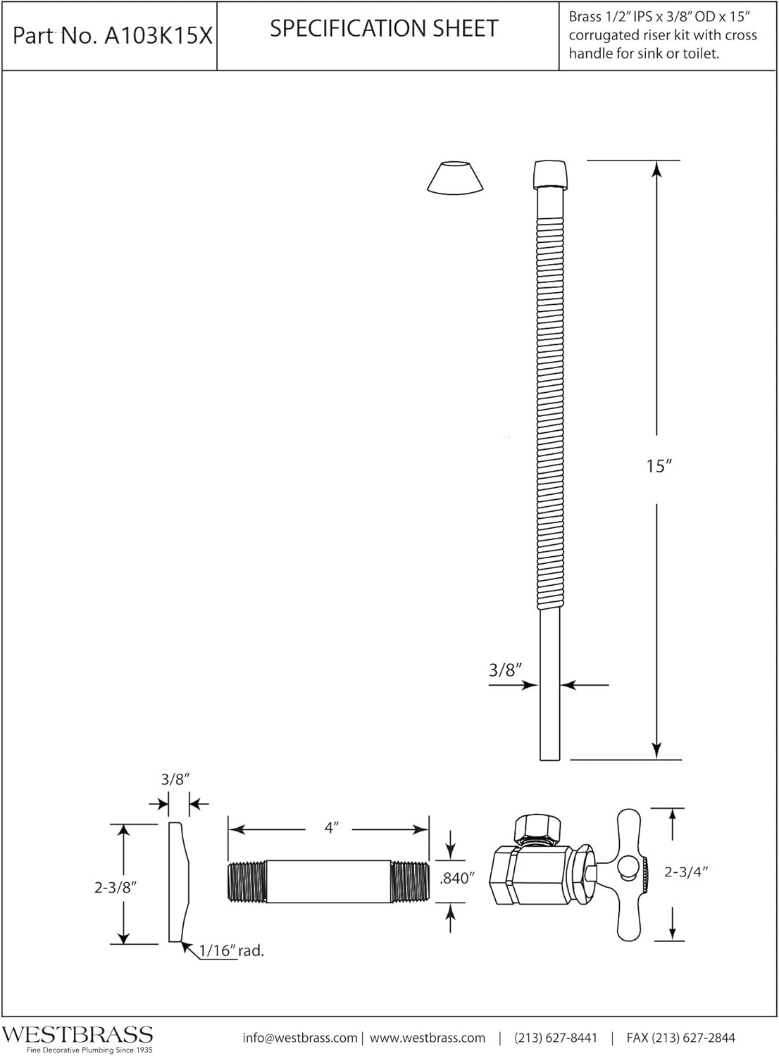 This cross handle angle stop kit from Westbrass is the perfect compliment for sinks and toilets. It uses a 1/2 inch IPS threaded inlet with a 3/8 inch OD compression outlet valve with nut and ferrule. The kit features a 15 inch corrugated riser with seals for sink or water closet. The valve uses traditional compression closure for positive seal. Available in a variety of stylish finishes, this item is sure to complement your existing fixtures. Be sure to check out our other model styles and VISIT OUR WESTBRASS STOREFRONT for more kitchen and bath items to stylize your home with convenient functionality and beauty.