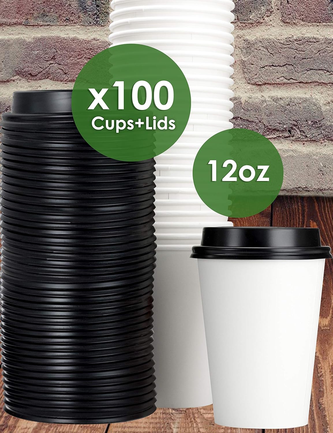 Recycle Your Lids after Drinking for Guilt-Free Disposal!The toppers on these premium, commercial-grade paper cups are completely recyclable and BPA-free, making them must-have supplies for any environmental enthusiast! Premium Materials and Design for Leak Free UseNot only are our travel-friendly disposable cups easy to clean up, they are designed smartly with your use in mind! Featuring tapered sides for ergonomic holding, rolled rims to keep dome lids in place, and a lining that stays leak-free for hours, these portable cups are perfect for holding beverages like morning joes, pumpkin spiced lattes, lemonades, juices, soups, espresso, and more! The lid also features a small pin hole, which is why you'll find your take out drinks flow smoother when used with our covers. Without the hole, your beverage will gurgle when it pours, leading to a poor drinking experience.Ideal For Your Restaurant, Bakery, Catering Company, Cafe and HomeUse these cute, microwavable throw away cups everywhere, from your kitchen coffee maker or dispenser to your office drink stand! These handy, nice to have accessories are great for serving at events and holiday celebrations like Christmas, Halloween, Thanksgiving, Easter, Valentine's, weddings, birthday parties and baby showers.100 Count Value PackGet the best deal by buying our 100 count case set of insulated drinking cups with dome lids.What’s in the box?You will receive (100) 12oz thermal paper cups with (100) dome lids. Sleeves and straws are not included.Satisfaction Assured for Life!If you aren’t completely satisfied with your order, simply email us, and we will respond within 24 hours to make it right even on the weekends. We absolutely assure your satisfaction!
