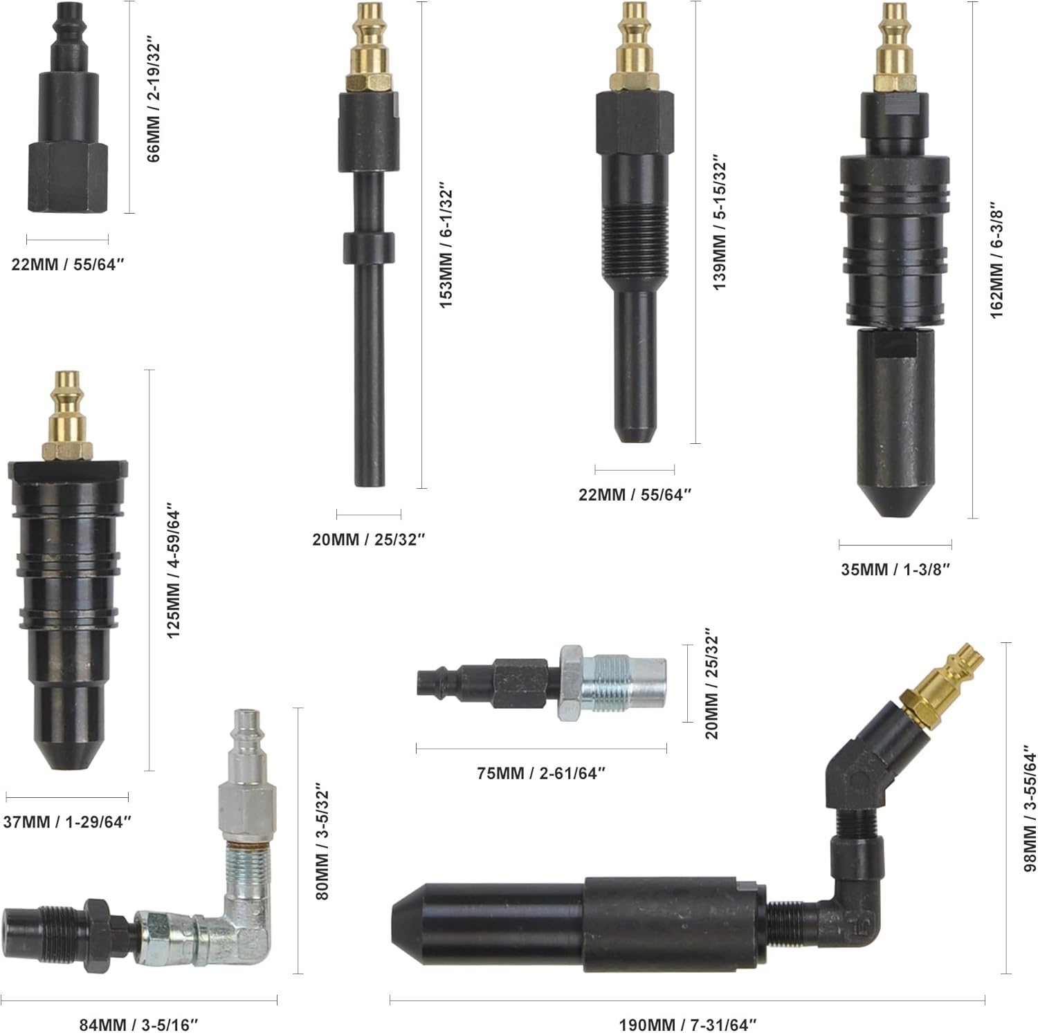 Compatible for Bacharach Case, J. I. 70 Series, 188 & 207 Compatible for Caterpillar 1100 and 3208 series Compatible for Deer, John Early 300, 400 & 500 series 276, 404 & 531 C.I.D. Compatible for Waukesha D155D 4 Compatible for Caterpillar "Capsule" type nozzle Fuel Injector models D-336 1674 1676 3406 3408 3412 Compatible for Cummins 5.5 bore engines: NH (855 Fuel Injector cubic inches) V-6 V-8 V-12 903 V-8 Cylindrical PTB Compatible for Cummins V-185 V210 V225 V555 VT-255 VT555 Compatible for Detroit Diesel 53, 71, 92, 110, 149, V53, V71 Compatible for Mercedes Benz 12mm Model 300 & 300 18mm Model 250 & 350 Turbo diesel 1978 Compatible for Allis Chalmers 6000 7000 10000 11000 Bedford 200, 220 300 330 466 Compatible for Deere, John 404 466 531 619 Compatible for Fiat Allis 8035-02-300 8035-02-301 8035 02-302 8045-02/03 Compatible for Ford Tractor All Fuel Injector Compatible for International D/DT 361 D/DT 429 DV 462 Compatible for Harvester DVT 550, DT/DV/DVT 573, 361, 407 Compatible for Mack Truck 405 457 475 510 519 605 672 673 674 711, 864 Compatible for ENDT-673 675 676 865 866 Onan DSL, MSDL Compatible for Waukesha 5.5" bore engines: NH(855 Fuel Injector cubic inches), V-6, V-8, V-12 & 903 V-8 Cyl PTB BMW 2.4L 12-1.25mm Compatible for Ford/IH Navistar 6.9 7.3L 10mm-1.00 Compatible for Ford 6.0L Power Stroke M14-1.25 Navistar/International VT365 (PMD Products kit exclusive) Compatible for General Motors 4.3 5.7L 10mm-1.00 Compatible for Chevy Luv/Isuzu 1.8 and 2.2 liter Glow plug 10mm-1.25 Compatible for Toyota 1.8L 10mm-1.25 Compatible for Cummins 6 BT, 4.02" bore, 5.9L 24mm-2.00 Compatible for Mercedes Benz Cars Trucks 24mm ports 24mm-2.00 Compatible for AUDI, Volkswagen, Volvo All cars Trucks 24mm-2.00 General Motors 4.3, 5.7, 6.7L Turbo Glow plug 10mm-1.25