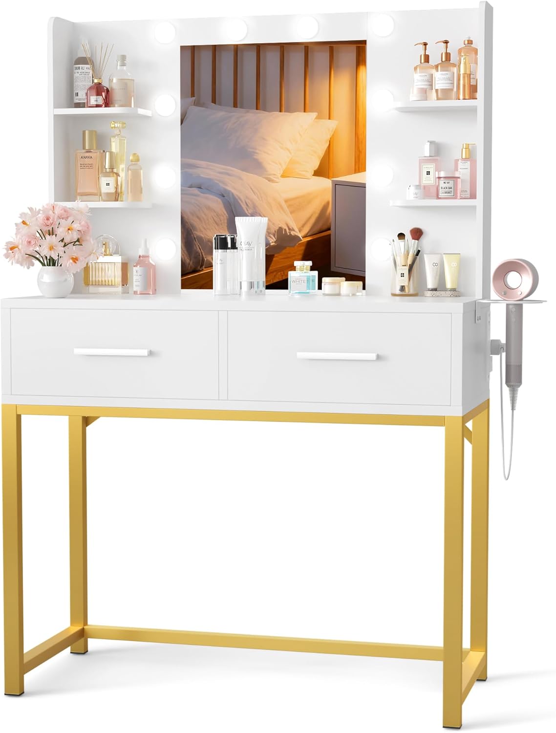 YESHOMY Vanity Desk Feature: Acurax Vanity Desk with Mirror, 11 Adjustable LED Lights in 3 Colors, 2 Spacious Drawers, Soft-Padded Storage Stool, Brightness Control, Ideal for Bedroom, Gloss White Specification Color: Gloss White Material: Wood, etc Package Dimensions:37"(L) x 19"(W) x 10"(H) Package includes: A vanity A stool A tool kit A manual of installation and usage Notice: There may be some differences between photos and items in term of color because the influence of lighting during the shooting or the settings of the computersโ display screen.