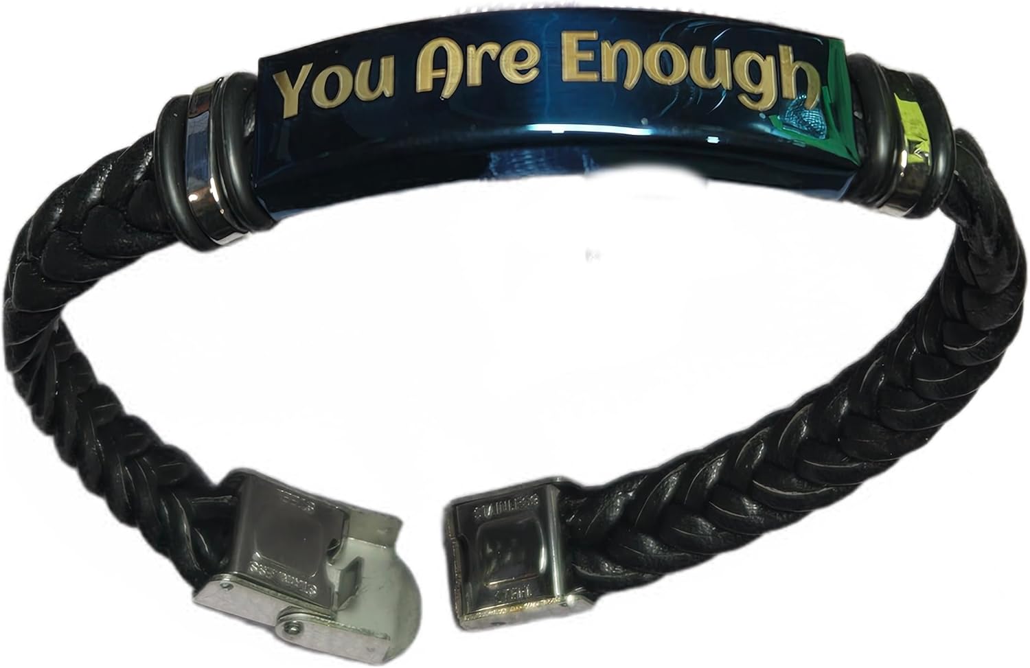 This meaningful "You Are Enough" bracelet combines inspirational messaging with contemporary style. The centerpiece features a striking blue titanium stainless steel plate with laser-engraved lettering that serves as a powerful daily reminder of self-worth and confidence. The sleek metallic rectangular plate is beautifully paired with a black braided genuine leather band that adds sophisticated texture and comfortable wear. Measuring 8.66 inches in length with a 0.25-inch thickness, this unisex design fits most wrist sizes comfortably. The secure stainless steel clasp ensures reliable fastening during everyday activities and casual wear. This versatile accessory suits both men and women who appreciate meaningful jewelry with empowering messages. The combination of durable materials and motivational engraving creates a piece that's both stylish and purposeful. Whether worn as a personal affirmation or given as a thoughtful gift, this bracelet offers a constant reminder of inherent self-value. The polished blue metallic finish contrasts elegantly with the black leather, creating a modern look suitable for daily wear.
