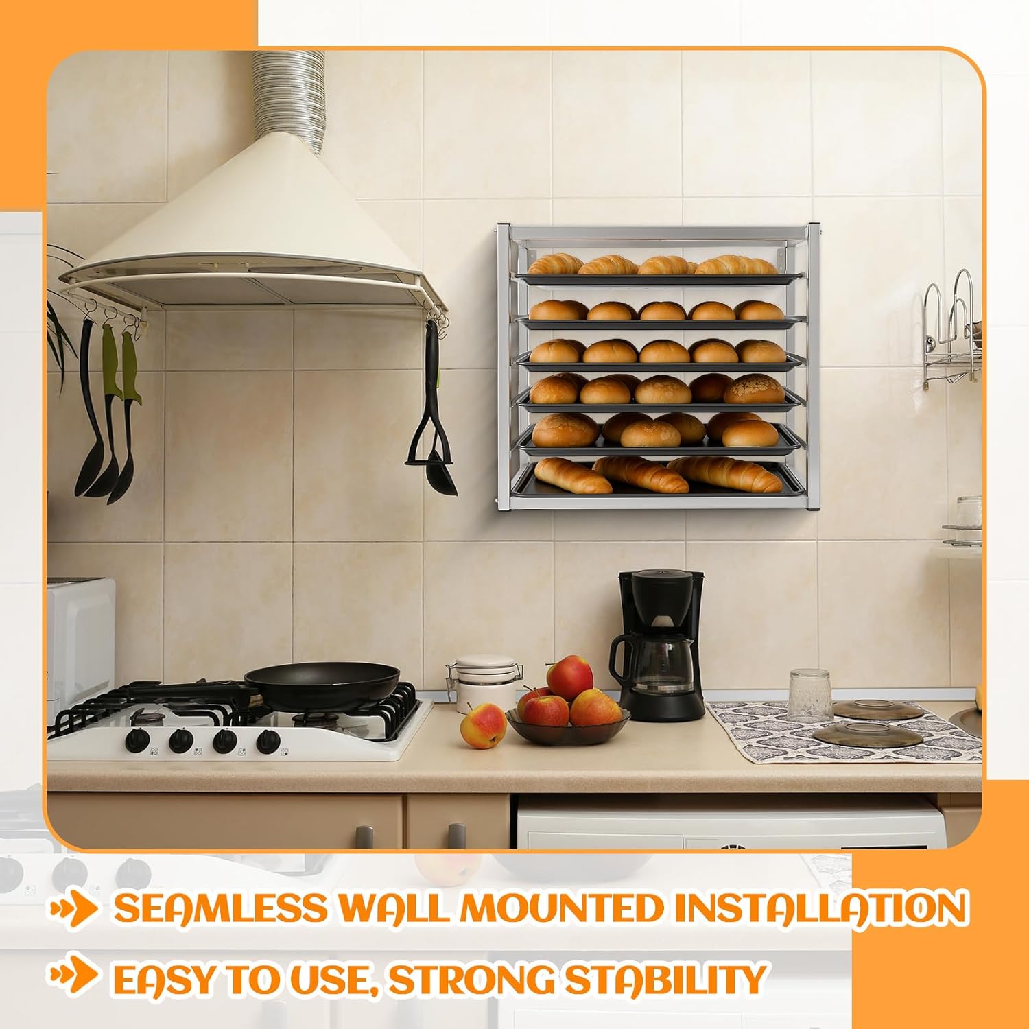 Features: Convenient wall-mounted design Enhance the flow of your prep space while creating valuable floor, reach, or countertop space with our wall-mounted racks. This is a seamless, space-saving solution that helps create a seamless workflow for your cooking operations. The wall-mounted bread tray rack enhances your cooking workspace. It is a versatile and space-saving solution that adds a sense of organization to your kitchen. Make full use of your available space to conveniently store and cool baked goods. Specifications: Material: aluminum Color: silver Size: 28 x 18 x 21 inches / 71.12 x 45.21 x 53.34 cm Package includes: 1 X Sheet Bun Pan Rack Notes: Manual measurement, please allow slight errors on size. The color may exist a slight difference due to different screen displays