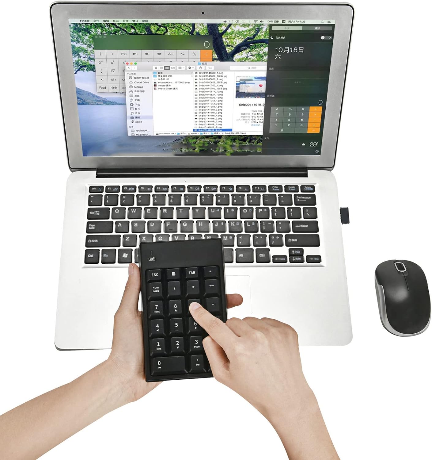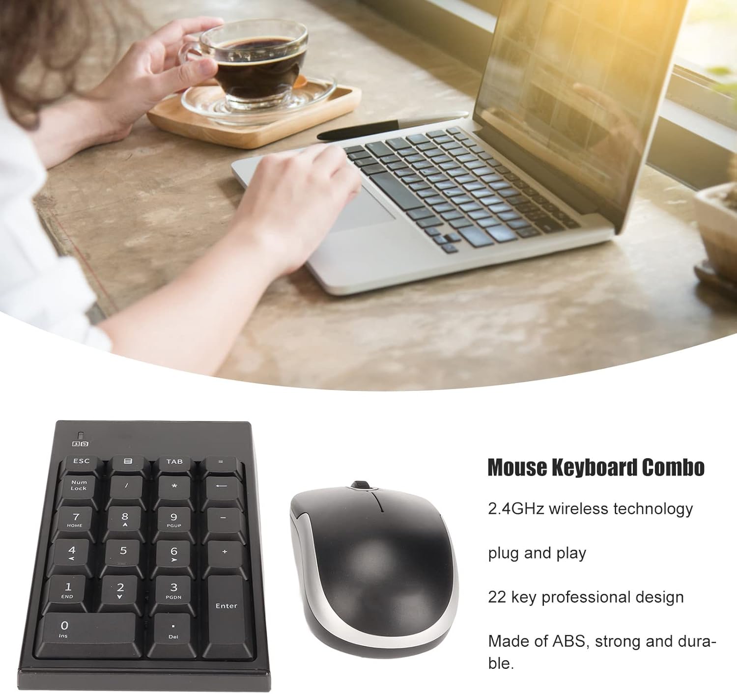 Feature:1. 2.4GHz : The number keyboard adopts 2.4GHz technology, plug and play, and no device driver is needed, so you can use it with confidence.2. 22 Keys: numeric keypad adopts 22 keys professional design and is suitable for banks, schools, companies, etc.3. Stable : USB mouse numeric keypad ensures stable , which is a digital keyboard without delay and has an effective distance of 10m.4. Wide Compatibility: Number pad mouse combo is compatible with for tablet,for ,for for Vista,for 7,for 8 and for 10 series.5. ABS Material: The number pad mouse combo is made of ABS material, which is , compact and slim, and easy to carry.Specification:Item Type: Number Pad Mouse ComboMaterial: ABSConnection Mode: 2.4G Effective Distance:10mNumber of Keys: 22 KeysMouse Resolution: 1200DPIBattery Type: 1 x AAA (Keyboard) ,1 x AA (Mouse) Battery (not Included)How to Use:PlugandplayPackage List:1 x Number Pad1 x Mouse1 x Receiver1 x User ManualNote:Shipping without batteries.